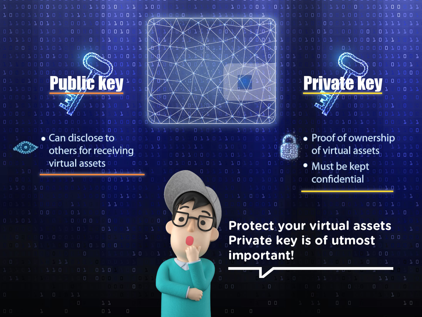Virtual assets are kept on the blockchain. We can use public key and private key to send/receive virtual assets. The public key is the address of the virtual asset on the blockchain. The private key is the password that proves ownership of the virtual assets. Public keys and private keys are stored in virtual asset wallets. Holder of the private key can transfer the virtual assets to another address. Therefore, if the private key is lost or stolen, investors may not be able to get back their virtual assets. Besides, if investors store their virtual assets in a trading platform, they may lose all their virtual assets if the platform collapses, ceases operation or is hacked. As the popular expression in the virtual asset world “Not your keys, not your coins” points out, if you do not own the private keys, you are not in control of your virtual assets (learn more).