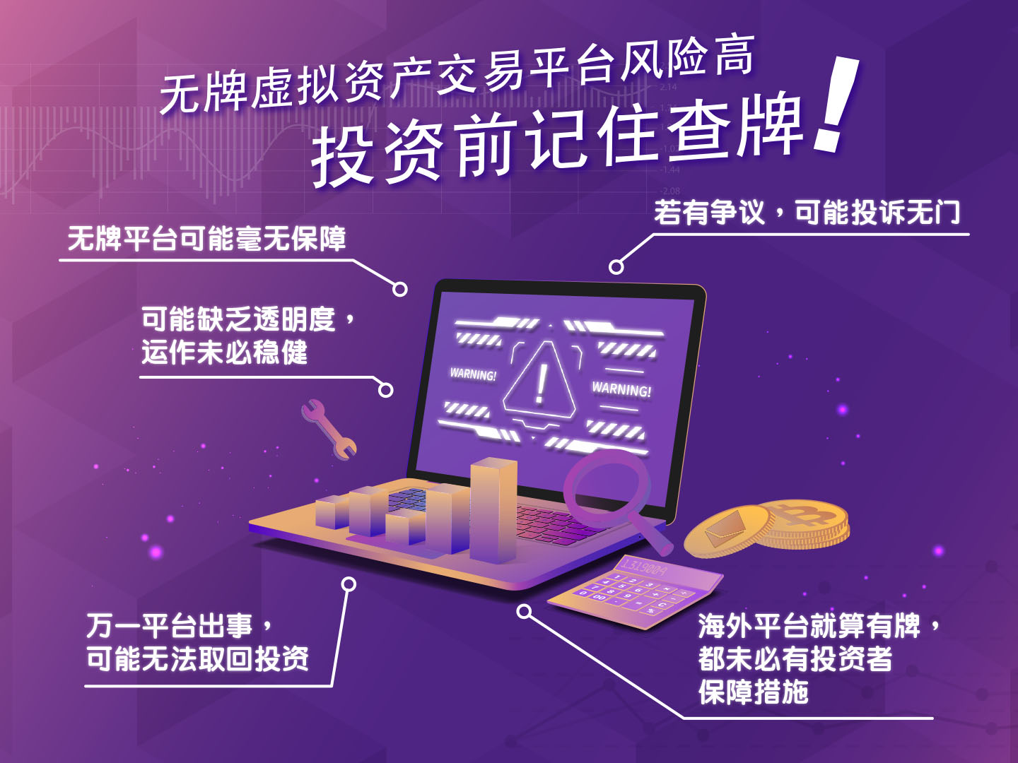 投资者须小心无牌及海外虚拟资产交易平台的风险。无牌平台可能毫无保障...