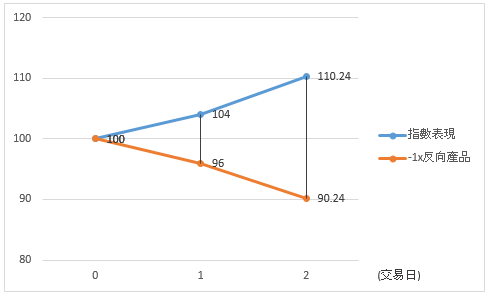 然而,於第2日完結時,該兩倍反向產品會錄得累計虧損1.44%,但相關指數的水平會與第1日開始時一樣 。